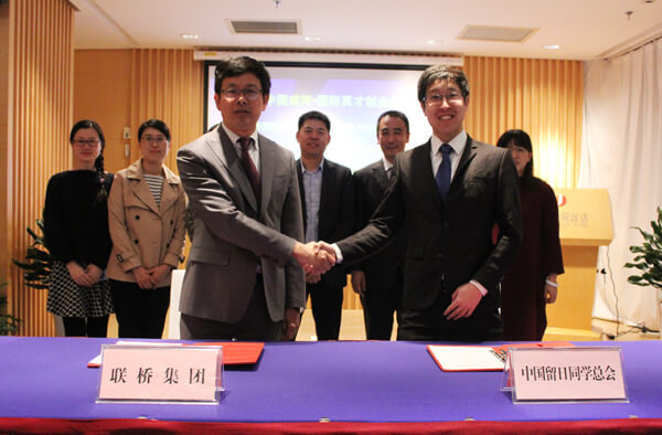 2017年3月5日,2017中國(guó)威?!?guó)際英才創(chuàng)業(yè)峰會(huì)海外博士(日本)威海行活動(dòng)開幕。期間,聯(lián)橋集團(tuán)與中國(guó)留日同學(xué)總會(huì)簽訂了共建“中日高端人才交流平臺(tái)”合作協(xié)議。聯(lián)橋集團(tuán)董事、副總經(jīng)理于福杰與中國(guó)留日同學(xué)總會(huì)副秘書長(zhǎng)劉恩璽代表雙方簽字。